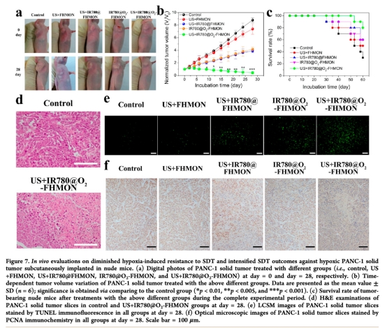 6 腫瘤治療數(shù)據(jù)來(lái)自圖7a,b,c,測(cè)量腫瘤體積變化、小鼠生存率和組織學(xué)分析(H&E、TUNEL、PCNA染色),顯示IR780@O2-FHMON結(jié)合超聲波能顯著抑制腫瘤生長(zhǎng)并誘導(dǎo) apoptosis,研究意義是整體驗(yàn)證納米平臺(tái)在體內(nèi)的治療效能和生物安全性。