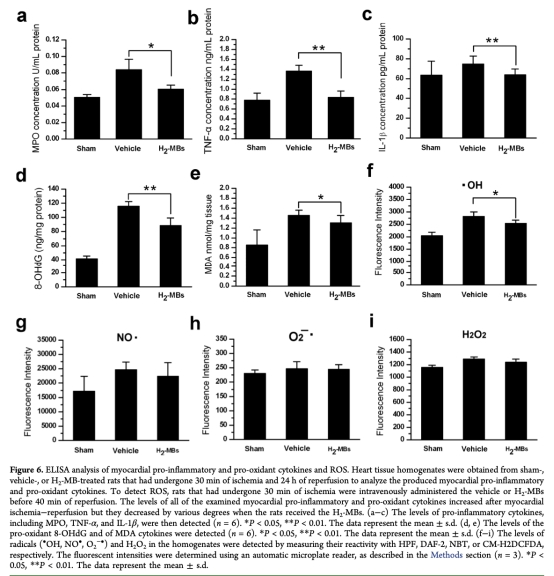 6 細胞凋亡和炎癥數(shù)據(jù)來自圖5和6,TUNEL染色顯示H2-MBs組凋亡細胞減少(8.62% vs 對照組35.53%),ELISA顯示炎癥因子(TNF-α、IL-1β)和氧化應(yīng)激標志物(8-OHdG、MDA)水平降低。研究意義是揭示H2-MBs通過抑制凋亡和炎癥通路發(fā)揮保護作用,機制與抗氧化相關(guān)。