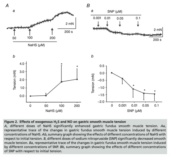 2 H2S和NO對張力的影響數(shù)據(jù):NaHS(50-200 μM)劑量依賴性地增強胃底平滑肌張力(從0 mN增至2.06±1.29 mN),而SNP(0.001-0.1 μM)劑量依賴性地降低張力(從0 mN降至-1.40±0.44 mN)。數(shù)據(jù)來自圖2。研究意義在于顯示H2S和NO對張力有相反作用,突顯它們在維持平滑肌收縮-舒張平衡中的拮抗關(guān)系。