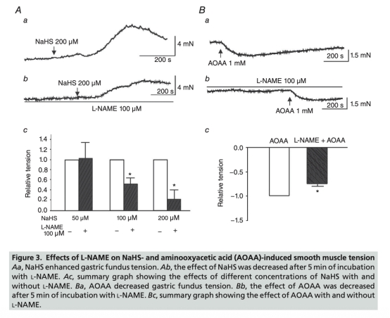 3 L-NAME對H2S誘導(dǎo)張力的影響數(shù)據(jù):L-NAME(100 μM)預(yù)處理顯著抑制NaHS(100和200 μM)誘導(dǎo)的張力增強,相對張力值從1降至0.52±0.097和0.22±0.19。數(shù)據(jù)來自圖3。研究意義表明H2S的張力增強作用依賴于NO通路,因為抑制NO合酶后H2S效應(yīng)減弱,提示H2S通過調(diào)節(jié)NO釋放間接起作用。