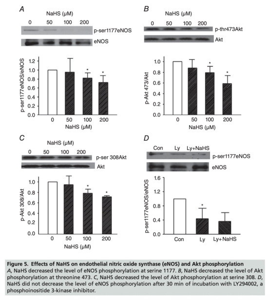 5 eNOS和Akt磷酸化數(shù)據(jù):NaHS(50-200 μM)處理降低eNOS Ser1177磷酸化(從1降至0.65±0.14)和Akt Ser308/Thr473磷酸化,LY294002(PI3K抑制劑)阻斷此效應(yīng)。數(shù)據(jù)來自圖5。研究意義表明H2S通過抑制PI3K/Akt通路減少eNOS活性,從而抑制NO生成,闡明了分子機制。