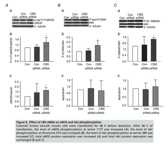 6 siRNA敲低CBS的影響數(shù)據(jù):CBS siRNA降低CBS表達,增加eNOS Ser1177磷酸化(從1.05±0.14升至1.38±0.36)和Akt磷酸化,總eNOS表達也增加。數(shù)據(jù)來自圖7和8。研究意義確認(rèn)內(nèi)源性H2S通過相同通路調(diào)節(jié)NO,基因敲低模擬了H2S抑制效應(yīng),強化了通路特異性。