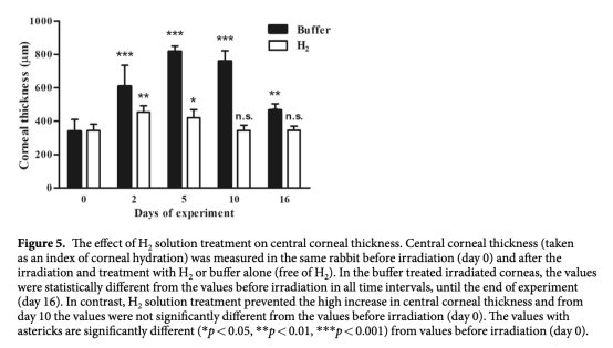 5. 角膜厚度數(shù)據(jù):使用超聲角膜測厚儀測量中央角膜厚度,作為評估角膜水合程度和透明度的指標。這些數(shù)據(jù)展示在Figure 5中。研究意義:角膜厚度增加(水腫)會導(dǎo)致光散射和混濁。H2處理能顯著減輕UVB引起的角膜水腫并促進其恢復(fù),直接證明了H2在維持和恢復(fù)角膜透明度方面的積極作用。