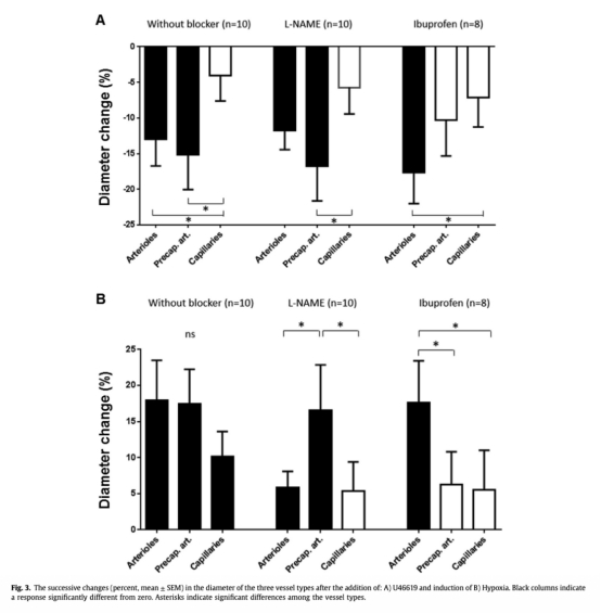 2. 缺氧誘導的血管擴張數(shù)據(jù):測量了在正常條件、加入L-NAME或布洛芬后,缺氧刺激引起的血管直徑變化百分比。關鍵發(fā)現(xiàn)是,在L-NAME存在下,小動脈和毛細血管的擴張顯著小于前毛細血管小動脈(p < 0.04);而在布洛芬存在下,毛細血管和前毛細血管小動脈的擴張顯著小于小動脈(p < 0.04),如圖3B所示。研究意義:直接證明了NO和COX產(chǎn)物在不同管徑血管的缺氧性血管擴張中扮演不同權重的角色。小動脈的擴張更易受COX抑制影響,而前毛細血管小動脈的擴張對NO抑制更敏感,這揭示了視網(wǎng)膜微血管調節(jié)的高度分區(qū)化,對理解疾病狀態(tài)下(如糖尿病視網(wǎng)膜病變)的局部血流失調機制至關重要。