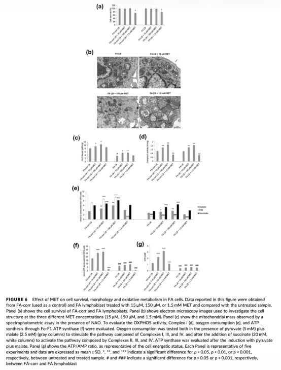 研究思路包括使用野生型、FA和FA校正的淋巴母細(xì)胞系以及HL60細(xì)胞系,進(jìn)行體外實(shí)驗(yàn)。細(xì)胞用不同濃度MET處理24小時(shí)后,通過(guò)多種技術(shù)評(píng)估效應(yīng):細(xì)胞存活和形態(tài)使用流式細(xì)胞術(shù)和電子顯微鏡;能量代謝通過(guò)測(cè)量ATP/AMP比、葡萄糖消耗、乳酸產(chǎn)生、氧消耗(使用丹麥Unisense電極)、復(fù)合物活性和線(xiàn)粒體質(zhì)量等;氧化應(yīng)激通過(guò)ROS、MDA、GSH和過(guò)氧化氫酶活性檢測(cè);信號(hào)通路通過(guò)Western blot分析AMPK磷酸化和Sirt1表達(dá);DNA損傷通過(guò)彗星試驗(yàn)和染色體斷裂試驗(yàn)。數(shù)據(jù)統(tǒng)計(jì)處理,比較濃度差異和細(xì)胞類(lèi)型差異。