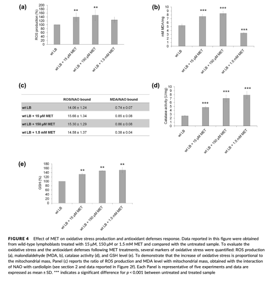 3 氧化應(yīng)激數(shù)據(jù):低濃度MET增加ROS產(chǎn)生(圖4a)和MDA水平(圖4b),但同時(shí)增強(qiáng)過(guò)氧化氫酶活性(圖4d)和GSH水平(圖4e);高濃度MET降低氧化應(yīng)激但不增強(qiáng)抗氧化防御。研究意義在于表明MET誘導(dǎo)的氧化應(yīng)激與線(xiàn)粒體活性相關(guān),低濃度觸發(fā)適應(yīng)性抗氧化反應(yīng),而高濃度直接抑制電子傳遞鏈,影響氧化還原平衡。
