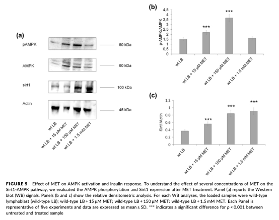 4 信號(hào)通路數(shù)據(jù):低濃度MET激活A(yù)MPK磷酸化和增加Sirt1表達(dá)(圖5),高濃度僅增加Sirt1表達(dá)。研究意義在于確認(rèn)MET通過(guò)AMPK/Sirt1通路調(diào)節(jié)線(xiàn)粒體生物合成,解釋其濃度依賴(lài)性代謝效應(yīng)。