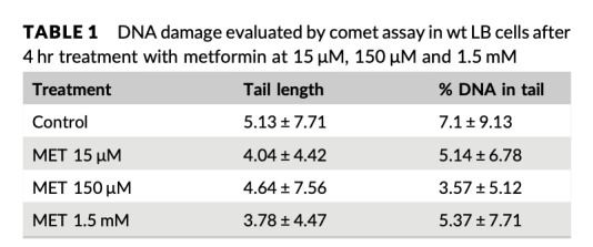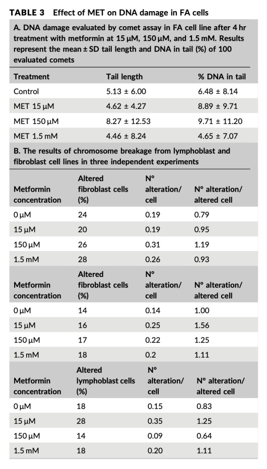5 DNA穩(wěn)定性數(shù)據(jù):彗星試驗(yàn)顯示MET處理未增加DNA鏈斷裂(表1),染色體斷裂試驗(yàn)在FA細(xì)胞中無(wú)改善(表3)。研究意義在于表明MET在測(cè)試濃度下不引起DNA損傷,但在FA細(xì)胞中無(wú)法糾正固有DNA修復(fù)缺陷,提示其治療局限性。