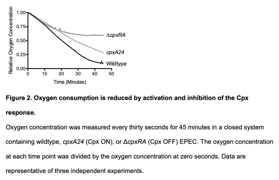 2. 氧消耗數(shù)據(jù):使用丹麥Unisense電極測量細菌的氧消耗率,顯示在cpxA24突變體(Cpx持續(xù)激活)中氧消耗減少,而在ΔcpxRA突變體(Cpx缺失)中氧消耗也異常降低,盡管轉錄未變(圖2)。這些數(shù)據(jù)的研究意義在于揭示Cpx反應不僅影響轉錄,還可能影響呼吸復合物的組裝、穩(wěn)定性或功能,表明Cpx在蛋白質質量控制中發(fā)揮作用。數(shù)據(jù)來自圖2。