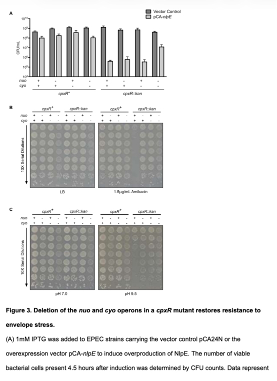 3. 應激敏感性數(shù)據(jù):通過CFU計數(shù)和生長稀釋實驗測量細菌對包膜應激的敏感性,數(shù)據(jù)顯示cpxR突變體對NlpE過表達、amikacin和堿性pH敏感,但缺失nuo和cyo可部分或完全恢復抵抗力(圖3)。這些數(shù)據(jù)的研究意義在于證明呼吸復合物在應激條件下具有毒性,Cpx調控這些復合物是適應應激的關鍵機制。數(shù)據(jù)來自圖3。