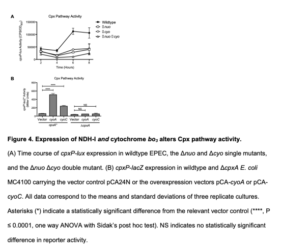 4. Cpx途徑活性數(shù)據(jù):使用cpxP報告基因測量Cpx途徑活性,顯示缺失nuo或cyo降低基礎Cpx活性,并抑制靜止期激活(圖4)。這些數(shù)據(jù)的研究意義在于表明呼吸復合物貢獻于Cpx信號的產生,可能通過產生應激信號(如錯誤組裝或氧化應激)來激活Cpx反應。數(shù)據(jù)來自圖4。