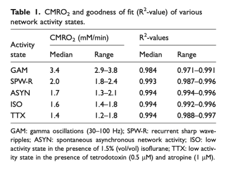 1 局部CMRO2數(shù)據(jù):測量了不同網(wǎng)絡(luò)活動狀態(tài)下的CMRO2值,顯示伽馬振蕩時最高(3.4 mM/min),尖銳波漣漪時中等(2.0 mM/min),異步活動和異氟烷時較低(1.7-1.6 mM/min),TTX時最低(1.4 mM/min)。這些數(shù)據(jù)來自圖2和表1。研究意義在于揭示了不同腦活動狀態(tài)的能量需求差異,伽馬振蕩作為高能量過程,可能與高級腦功能相關(guān)。