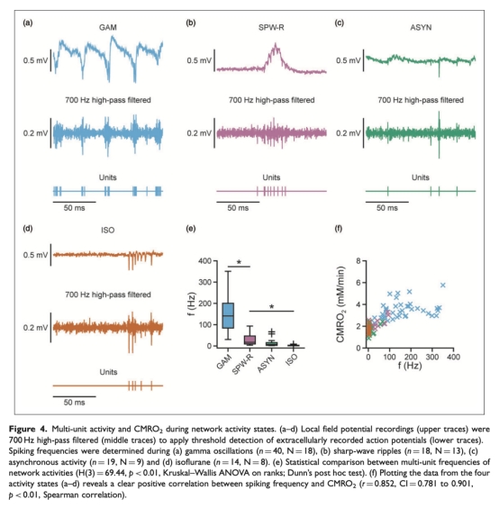 3 多單元活動數(shù)據(jù):通過高通濾波提取動作電位頻率,顯示伽馬振蕩時多單元活動頻率最高,與CMRO2正相關(guān)(r=0.852)。這些數(shù)據(jù)來自圖4。研究意義在于確認(rèn)神經(jīng)元放電活動與能量代謝直接相關(guān),支持動作電位和突觸傳遞在能量預(yù)算中的貢獻(xiàn)。