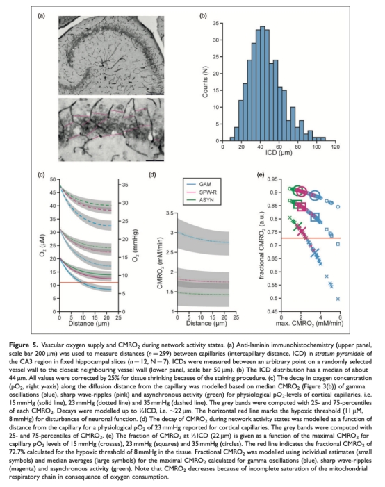 4 毛細(xì)血管距離數(shù)據(jù):通過抗層粘連蛋白染色測量海馬體CA3區(qū)域毛細(xì)血管距離(ICD),中位數(shù)為44 μm。這些數(shù)據(jù)來自圖5a和5b。研究意義在于提供了微血管架構(gòu)的基礎(chǔ)數(shù)據(jù),用于建模氧擴(kuò)散距離。