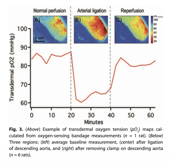 1 氧傳感涂敷繃帶在檢測組織氧合變化方面與近紅外成像和Clark電極顯示可比趨勢,能可靠響應缺血和再灌注事件。