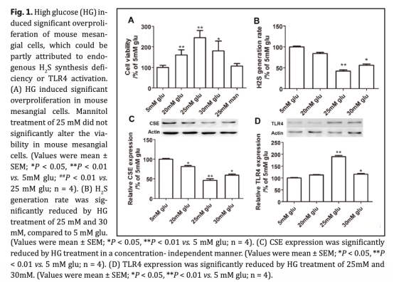 1. 高葡萄糖通過抑制硫化氫合成誘導小鼠系膜細胞過度增殖,這一過程依賴于TLR4的激活。