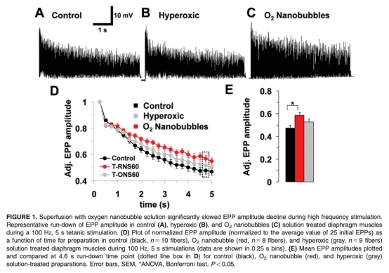 這篇論文研究了氧納米氣泡對小鼠膈肌神經肌肉接頭傳遞和肌肉功能的影響。摘要表明,氧納米氣泡提供了一種新的組織氧合方法。研究發現,在超級灌注氧納米氣泡溶液時,高頻神經刺激減緩了神經傳遞下降,增加了誘發的終板電位振幅和量化內容,但不影響自發性活動。電鏡顯示氧納米氣泡處理后的神經肌肉接頭積累了大的突觸小泡和內涵體樣結構。氧納米氣泡溶液對等長肌肉力無影響,但顯著降低了神經刺激肌肉的疲勞性和最大力恢復時間。結論是氧納米氣泡能增強神經傳遞并減少肌肉疲勞中神經傳遞失敗的概率。