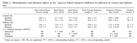 2. 血流動力學參數(表2):SGLT抑制后,糖尿病動物腎小球濾過率(GFR)從1.51±0.14 ml/min降至1.15±0.14 ml/min,意義在于證明SGLT抑制能減輕糖尿病誘導的腎小球超濾,提示SGLT活性與超濾相關。