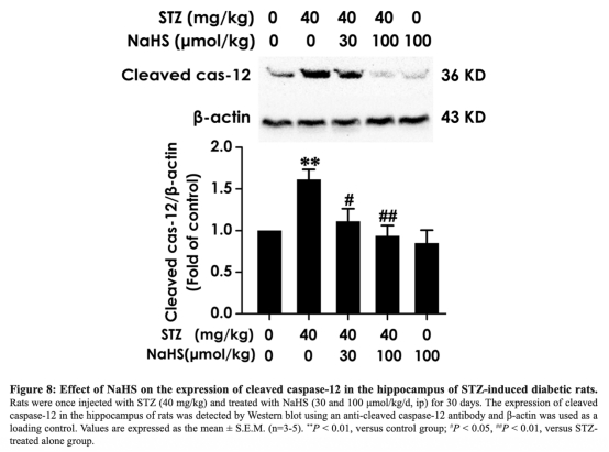 9. 海馬cleaved caspase-12蛋白表達(圖8):糖尿病大鼠cleaved caspase-12表達升高,NaHS處理降低其水平。研究意義在于表明H2S能減少ER應激誘導的細胞凋亡,進一步支持其神經保護機制。數據來自圖8。