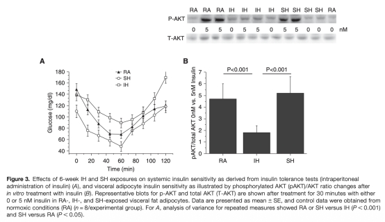 4 胰島素敏感性:IH組小鼠出現系統性胰島素抵抗和vWAT胰島素信號通路受損(pAKT/AKT降低),SH組則保持敏感。研究意義在于揭示IH特異性導致代謝功能障礙。數據來自圖3A和3B。