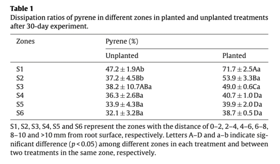1 芘濃度和消散比率:數據來自Table 1,顯示種植處理在S1區(0-2mm)消散比率最高(71.7%),隨距離增加而降低;S1和S2區(0-4mm)顯著高于未種植處理。研究意義是直接證明菹草根際效應對芘降解的增強作用,且作用范圍限于4mm內,為根際修復提供空間范圍依據。
