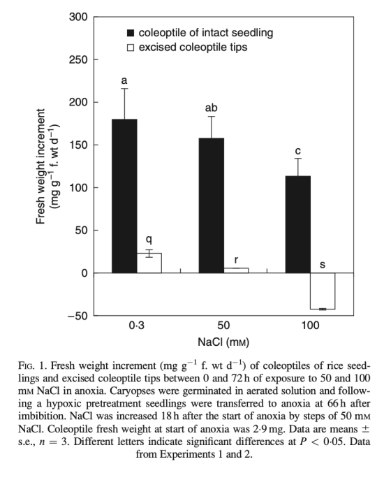 1. 生長數據:測量胚芽鞘鮮重增量,顯示在缺氧條件下,50 mM NaCl使完整幼苗生長減少15%,100 mM NaCl減少40%;外植胚芽鞘在50 mM NaCl下生長減少75%,100 mM NaCl下致命損傷。數據來自FIG.1。研究意義是表明NaCl脅迫加劇缺氧能量危機,生長減少可能為節能以適應脅迫,揭示物種耐受性差異。
