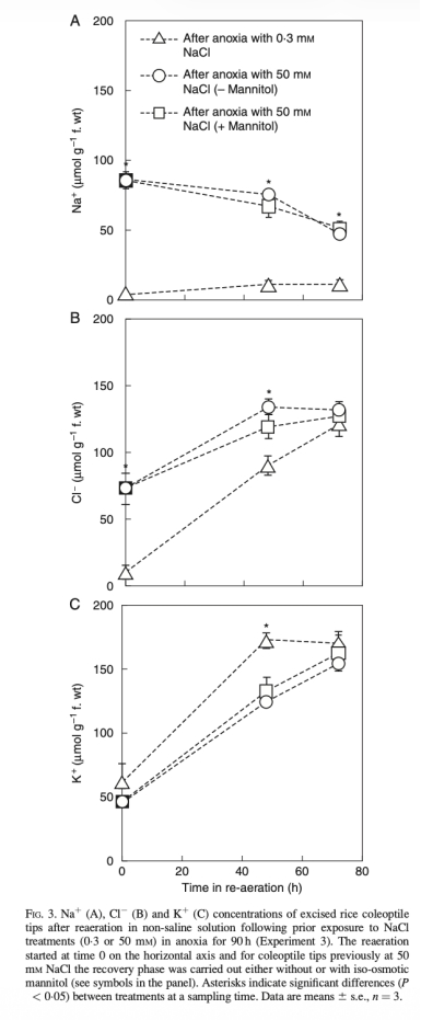 1. 水稻幼苗胚芽鞘能耐受缺氧結合高NaCl(完整幼苗100 mM,外植胚芽鞘50 mM),通過減少生長、降低離子通量和能量經濟型運輸系統實現節能。