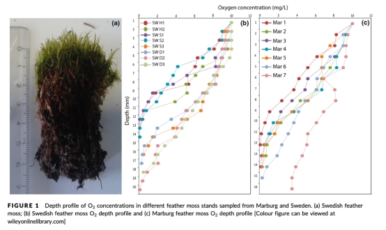 1. 氧氣深度剖面:使用丹麥Unisense氧氣微傳感器測量苔蘚叢中的氧氣濃度,顯示氧氣隨深度減少,底部出現缺氧層。數據來自FIG.1。研究意義是證實苔蘚叢中存在厭氧微環境,為產甲烷提供必要條件,支持甲烷排放的微生物機制。