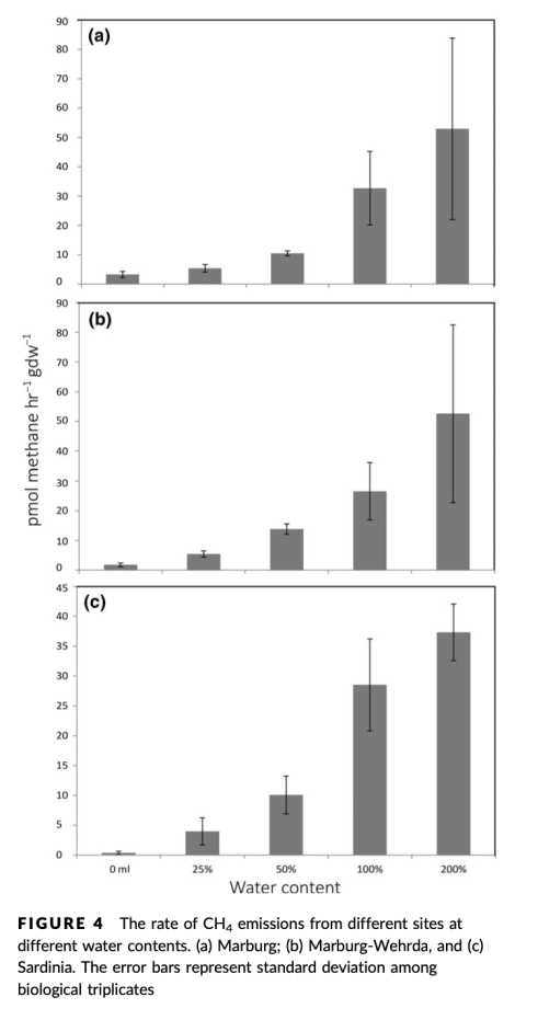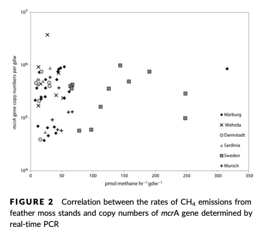 3. mcrA基因拷貝數:通過實時PCR測定,顯示104-105拷貝/g dw,與排放速率無線性相關。數據來自Figure 2。研究意義是評估產甲烷菌豐度,但表明排放受環境因素而非單純菌群大小驅動。