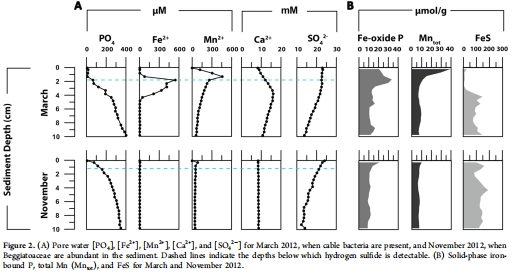 數據:對比了3月(電纜細菌活躍)和11月(Beggiatoaceae活躍)的孔隙水[PO?], [Fe2?], [Mn2?]和固體相鐵結合磷、總錳、FeS的含量。