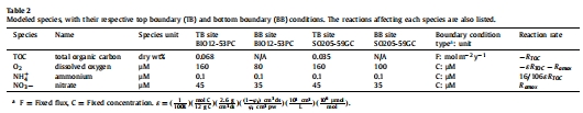 地球化學建模:建立一維反應-運輸模型(參數(shù)見表2和表3),量化氧氣、硝酸鹽等溶質(zhì)的擴散通量(表4)和有機質(zhì)降解速率,從而驗證觀測結(jié)果并深入理解其內(nèi)在機制。