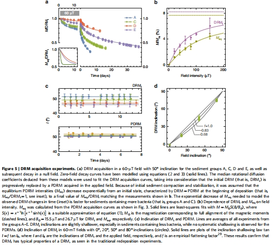 數據:展示了所有沉積物組(A-E)在施加磁場和關閉磁場后,磁化強度隨時間變化的曲線。活體沉積物樣品呈現出清晰的獲得和衰減趨勢,而干燥的對照樣品(顆粒無法旋轉)則沒有。