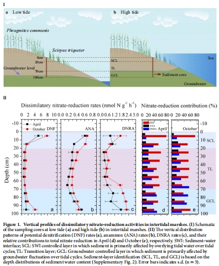 本研究探討了潮汐泵浦效應(yīng)(tidal pumping)如何促進潮間帶沼澤中的異化硝酸鹽還原(Dissimilatory Nitrate Reduction)過程。潮間帶沼澤由于周期性的潮汐漲落,其生物地球化學(xué)過程深受影響。本研究以長江河口潮間帶為研究對象,首次綜合運用同位素示蹤技術(shù)(15N)和分子生物學(xué)方法,揭示了三種主要的異化硝酸鹽還原途徑——反硝化作用(Denitrification, DNF)、厭氧氨氧化(Anammox, ANA)和異化硝酸鹽還原為銨(DNRA)——的活性和相關(guān)功能微生物群落的垂直分布特征。研究發(fā)現(xiàn),硝酸鹽還原活性和功能菌的豐度在沉積物-潮水界面(SWI)和潮汐驅(qū)動的地下水波動層(GCL)均顯著增強。這一分布模式表明,潮汐泵浦(即潮汐漲落驅(qū)動的水體和溶質(zhì)在沉積物中的往復(fù)運動)是維持潮間帶高強度硝酸鹽還原的關(guān)鍵機制。該機制進一步得到了孔隙水營養(yǎng)鹽剖面、潮汐周期內(nèi)氮組分動態(tài)變化以及潮汐模擬實驗的支持。本研究證實了潮汐在調(diào)控異化硝酸鹽還原途徑動態(tài)中的核心作用,為理解潮間帶沼澤乃至全球氮循環(huán)提供了新的視角。