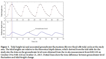 野外采樣與監(jiān)測:在長江河口崇明島東灘的潮間帶(圖1I),于2013年4月(春季)和10月(秋季)采集深達100厘米的沉積物柱樣。同時,在連續(xù)50小時的春潮期間,監(jiān)測地下水位波動(圖5)和各深度孔隙水營養(yǎng)鹽(NH4+, NOx-)的時序變化(圖6)。