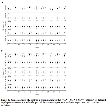 數(shù)據(jù):地下水位隨潮汐漲落而明顯波動,且相對于潮位變化存在約1小時的滯后(圖5)。在沉積物表層和80厘米深度,孔隙水中的NH4+和NOx-濃度在潮汐周期內(nèi)表現(xiàn)出顯著的時序性變化(圖6)。