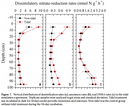 數(shù)據(jù):在室內(nèi)模擬實驗中,與有潮汐作用的處理組相比,無潮汐作用的對照組其深度積分后的DNF, ANA和DNRA速率顯著下降了26.8%-45.2%。