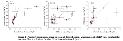 數(shù)據(jù):功能基因(nirS, 厭氧氨氧化菌16S rRNA, nrfA)的豐度垂直分布與對應(yīng)的過程速率(DNF, ANA, DNRA)高度一致,也呈現(xiàn)出雙峰模式。統(tǒng)計顯示,基因豐度與過程速率之間存在顯著正相關(guān)關(guān)系。