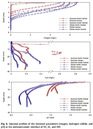 數據:O?在SWI之下極薄層內(< 4 mm)即被耗盡,夏季的O?滲透深度(約1.3 mm)淺于冬季(約3.2 mm)。H?S在夏季的沉積物中更早出現(約4 mm深度)且濃度更高(NC點最高達4.62 mg/L),表明夏季硫酸鹽還原作用更強烈。pH值在表層略有下降。