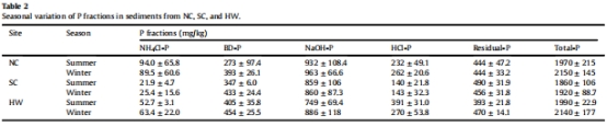 沉積物磷形態季節性變化(來自表2):