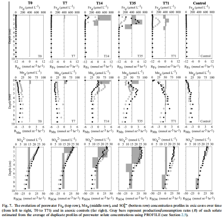 數據:在e-SOx活躍期(T14, T35),孔隙水中Fe2?和Mn2?在亞氧化層(~2-4 cm)出現明顯的濃度峰值。Ca2?濃度在表層附近顯著升高。SO?2?剖面在e-SOx發展后出現分層結構,表層呈現SO?2?的生成,深層則顯示消耗。