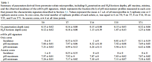 沉積物微環境剖面(O?, pH, H?S)(來自圖2和表1):
