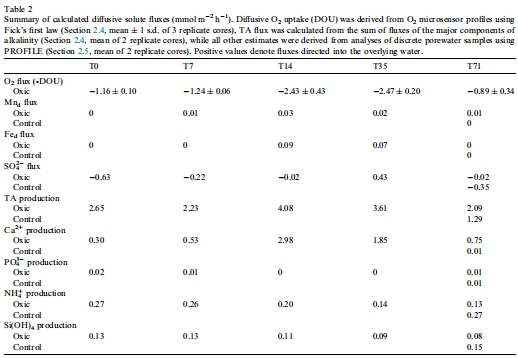 數據:e-SOx活動高峰期(T14),沉積物-水界面的總耗氧量(TOU)、溶解無機碳(DIC)通量、堿度(TA)通量和鈣(Ca2?)通量均達到峰值,較初始值(T0)顯著增加(TOU: +82%, DIC: +140%, TA: +845%, Ca2?: +488%)。相反,磷酸鹽(PO?3?)通量在e-SOx活躍期被有效“封蓋”,降至接近零。銨(NH??)通量隨時間下降,而硝氮(NOx?)通量由流入轉為流出。