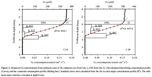 研究意義:較高消耗率(S2)與有機碳含量正相關(表1),反映站點異質性。DBL作為擴散屏障,其厚度控制O?通量,影響底部缺氧程度。通量數據為湖泊碳循環模型提供了關鍵參數。