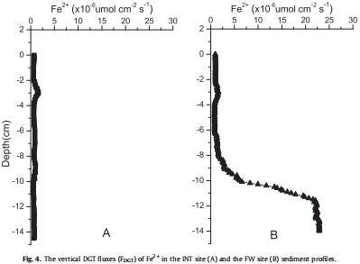 本研究利用薄膜擴(kuò)散梯度技術(shù)(DGT)調(diào)查了中國煙臺污染嚴(yán)重的云鳥河河口的潮間帶(INT)和淡水(FW)點位沉積物孔隙水中溶解性硫化物、Fe2?和溶解性活性磷(DRP)的垂直通量剖面。摘要指出,在表層沉積物中,DRP的有效性隨深度增加而增加,而硫化物減少,表明在缺氧沉積物中硫化物的積累可以增強(qiáng)磷的釋放。在鹽度對比鮮明的點位,鐵還原和硫酸鹽還原的相對主導(dǎo)地位不同:在潮間帶點位上層沉積物中鐵還原占主導(dǎo),而在淡水點位則相反(硫酸鹽還原占主導(dǎo)),另一種過程分別在每種情況的更深層占主導(dǎo)。磷酸鹽的釋放主要受鐵還原控制。