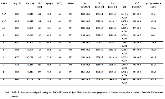 數據:溫度、鹽度、O?、DIC、TA、pH、SO?2?和pCO?。例如,近河口站點(Z、A)底部水O?濃度為244-245 μmol L?1,pCO?為364-407 μatm。