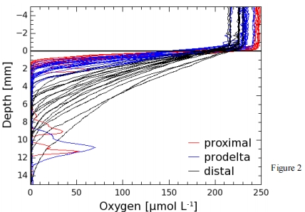 數據:氧氣濃度隨沉積物深度快速下降,近端、前三角洲和遠端區域的平均氧氣滲透深度(OPD)分別為1.7±0.4 mm、3.3±1.3 mm和8.2±2.6 mm。部分剖面顯示生物擾動引起的氧氣峰值。