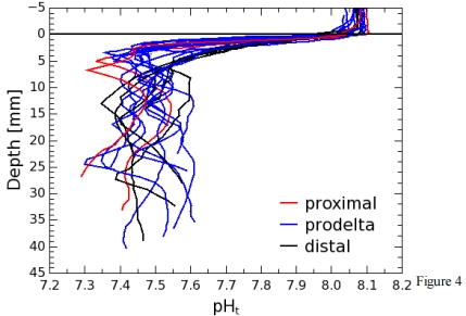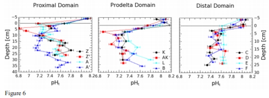 數據:pH在沉積物-水界面下方立即下降0.6-0.7單位,在OPD以下出現拐點并緩慢回升至7.4-7.6。近端區域pH梯度更陡。