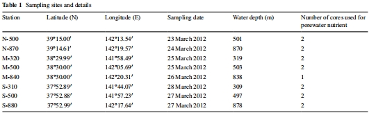 站點選擇與采樣:基于地震前調查,在東北沿岸設置3個斷面(N、M、S線),涵蓋310-880米水深的8個站點(Table 1)。2012年3月使用多管采樣器采集沉積物巖心,確保樣品代表擾動后狀態。