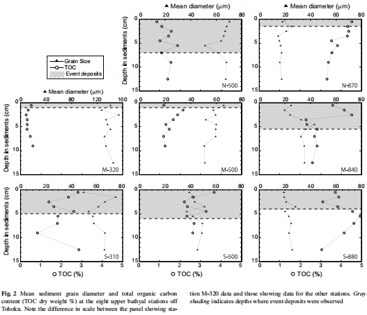 數據:Fig. 2顯示事件沉積厚度1-7厘米,粒度較粗(如站點M-320平均粒徑大)。TOC在事件沉積層較低(如M-320站<1%)。