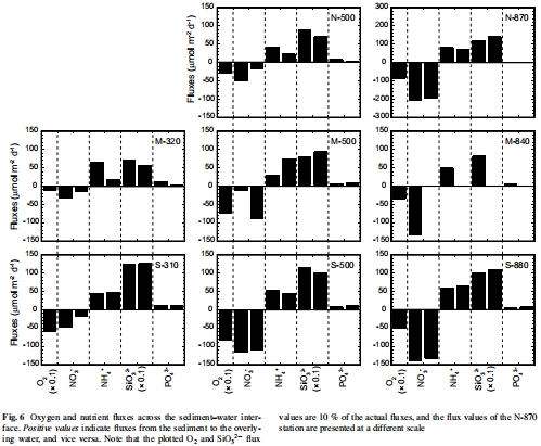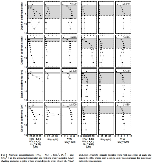 數據:Fig. 5顯示孔隙水NO??隨深度消耗,NH??和PO?3?積累;Fig. 6計算通量,如NO??通量在深水站點較高。